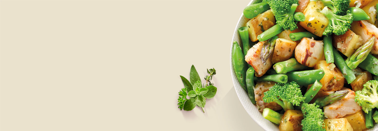 Groentemix in wisselende verhoudingen 43% (sugarsnaps, sperziebonen, groene asperge, broccoli), gegrilde aardappel 30%, gegrilde kip 12% [kip (Beter Leven keurmerk 1 ster), maiszetmeel, dextrose, zout], water, boter (MELK) 3%, sjalot, koolzaadolie, ui, tapiocazetmeel, zout, citroensap, knoflook, salie, peterselie, oregano, tijm, witte peper.