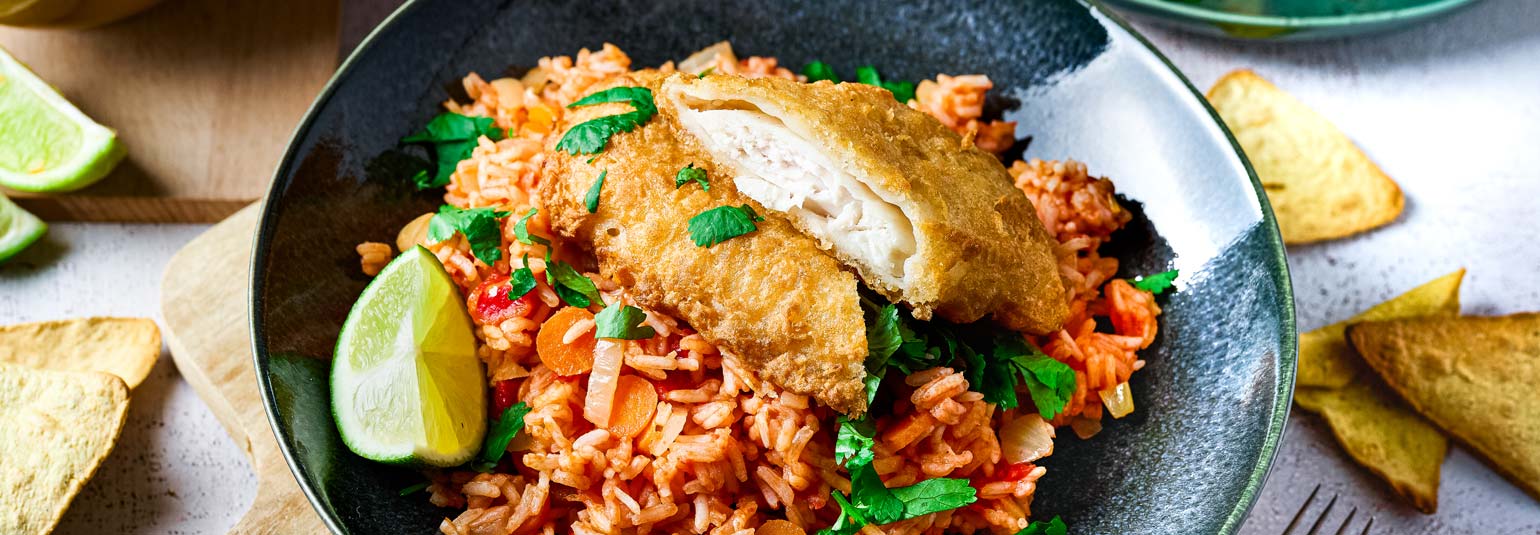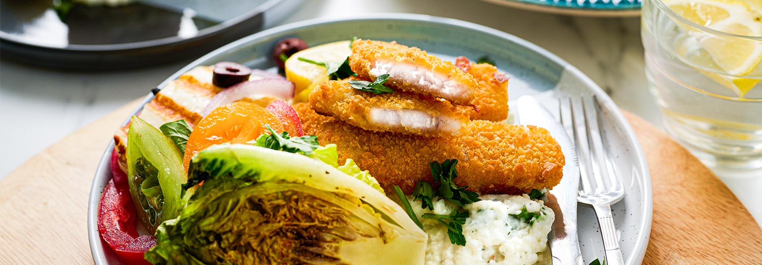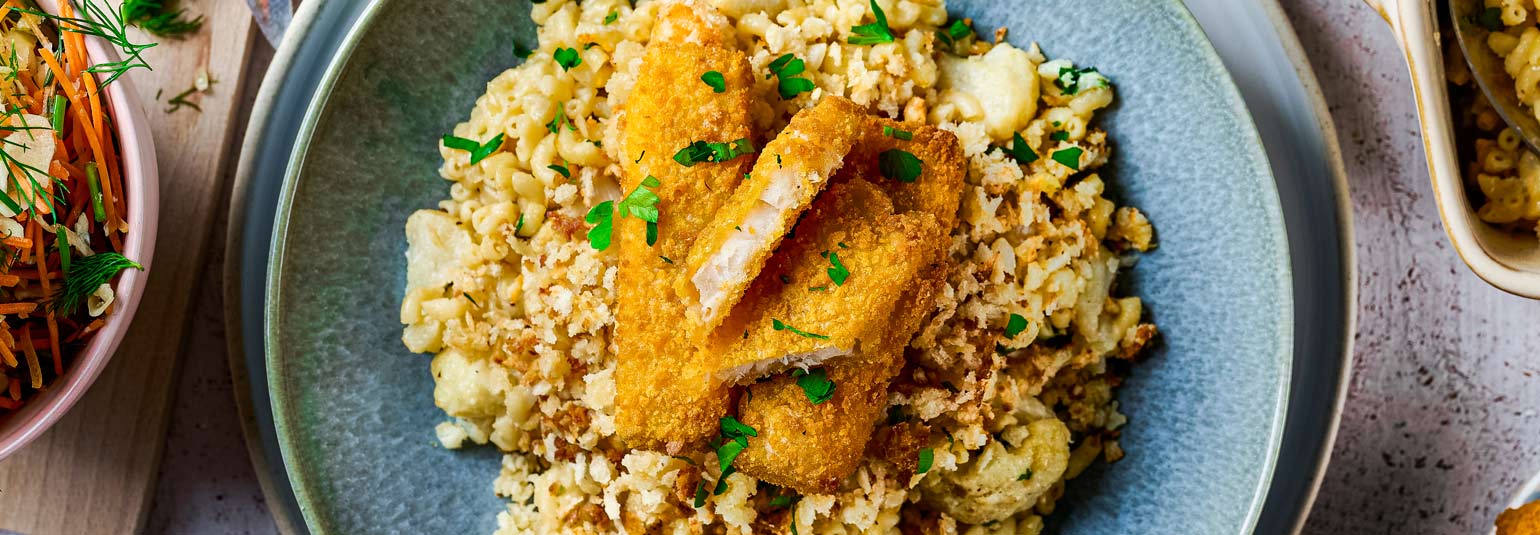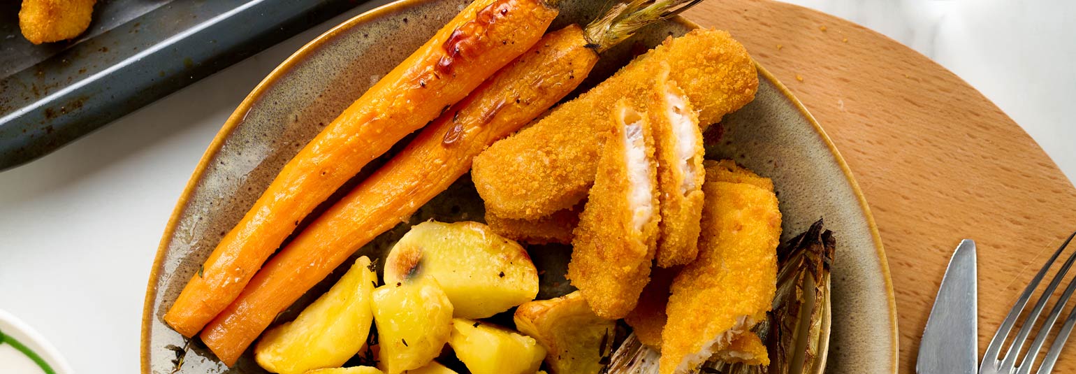 Vissticks met gegratineerde mosterdpuree en doperwten