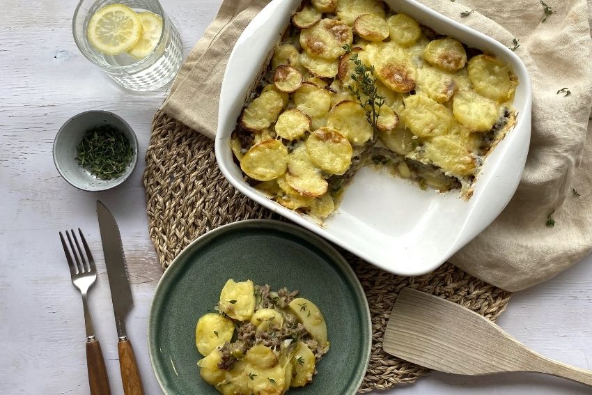 - Meng 2/3 van de aardappelschijfjes met het gehakt en de prei met roomsaus, vul de ovenschaal en eindig met een laag van de resterende aardappelschijfjes.