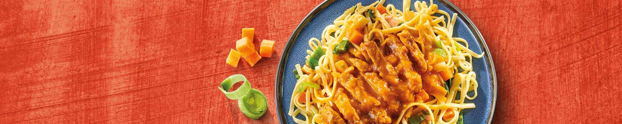 Maaltijd. 1 portie tarwenoedels met groenten en ei, gedoseerd naast gemarineerde varkensreepjes, met een zoetzure saus. Diepvries.