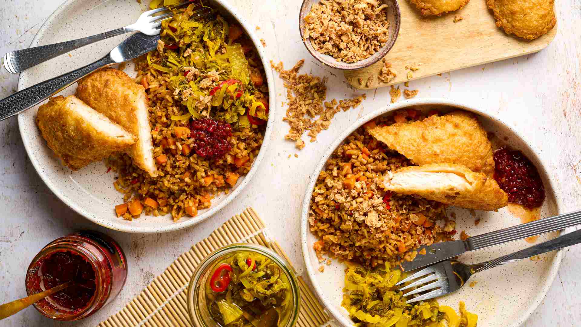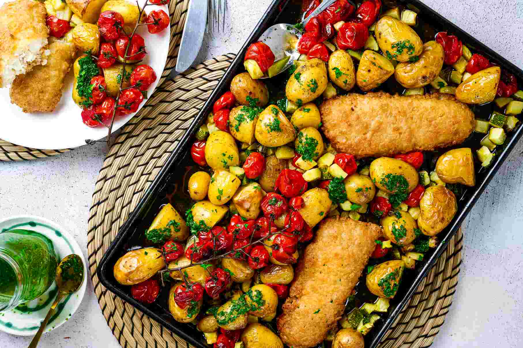 Vissticks met gegratineerde mosterdpuree en doperwten